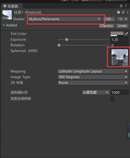 4、新建材质球 Shader 选择 Skybox/Panormic