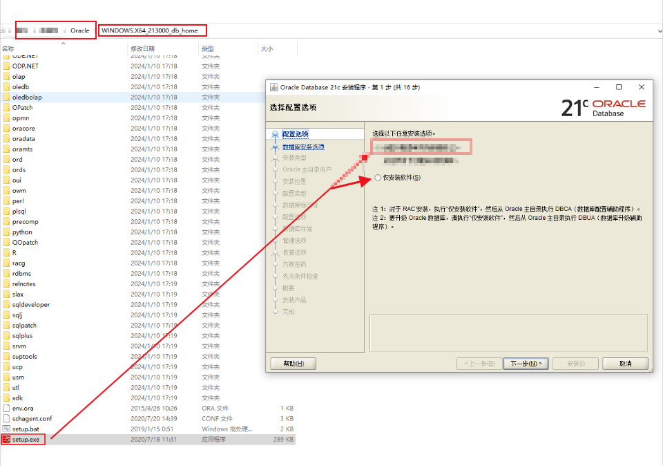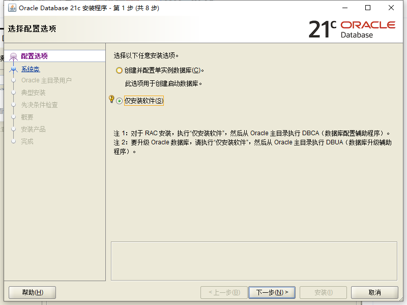 (1)先安装软件(不强求;因为若选择'创建并配置单实例数据'会遇到数据库实例目录问题无法修改问题,所以分步安装的)