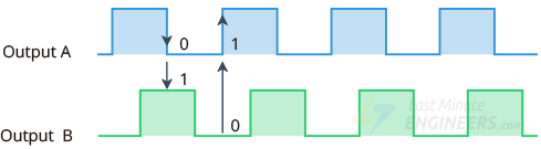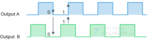 当您转动旋钮时,A 和 B 按照特定顺序与公共接地引脚 C 接触,具体顺序取决于转动旋钮的方向。当它们与公共地接触时,会产生两个信号。这些信号存在 90° 异相,因为一个引脚先于另一个引脚接触公共地。它被称为正交编码。