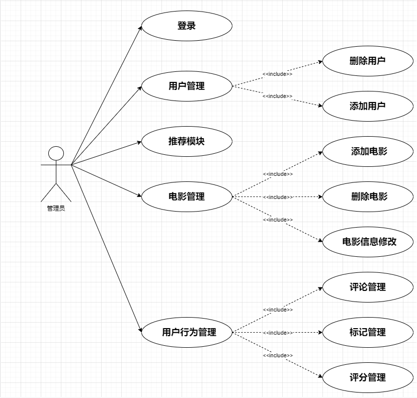 从管理员的角度来看,管理员在系统中具有最高权限,其主要是对用户信息以及电影信息进行维护与管理操作。管理员可以随时添加新电影,以及对电影信息进行删除,更新修改以及检索等,管理员还可以添加、删除、查找用户信息,还可以对用户行为进行管理。管理员的用例图如下: