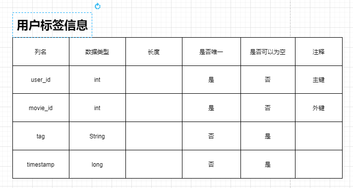 物理模型是概念模型的具体表示,描述了数据在物理存储介质上的具体组织结构,不但与数据管理系统有关,同时还与具体的操作系统及硬件有关。物理数据模型将综合考虑各种存储条件的限制,进行数据库的设计,从而真正的实现数据在数据库中的存放。其主要的工作是根据逻辑数据模型中的实体、属性、联系转换为对应的物理模型中的元素,包括定义多有的表和列,定义外键以维持表之间的联系等。本文以电影信息,用户评分信息和电影标签信息为例:
