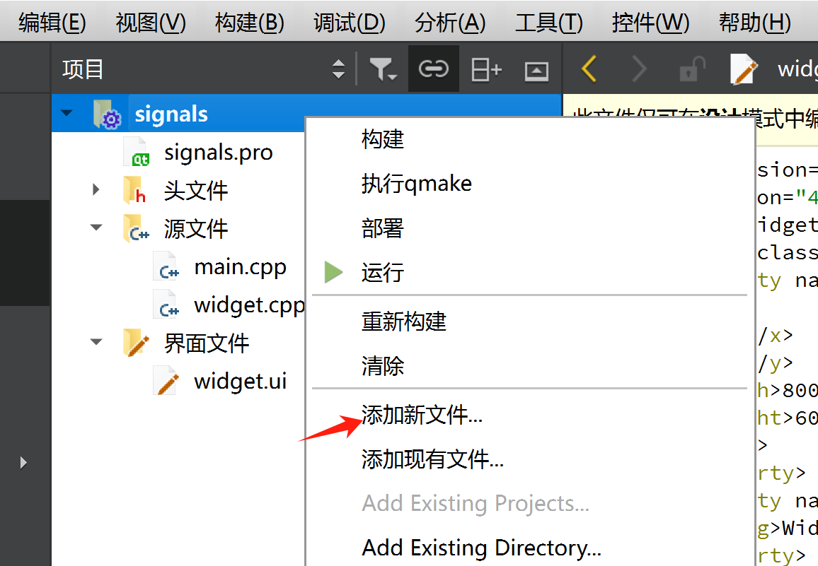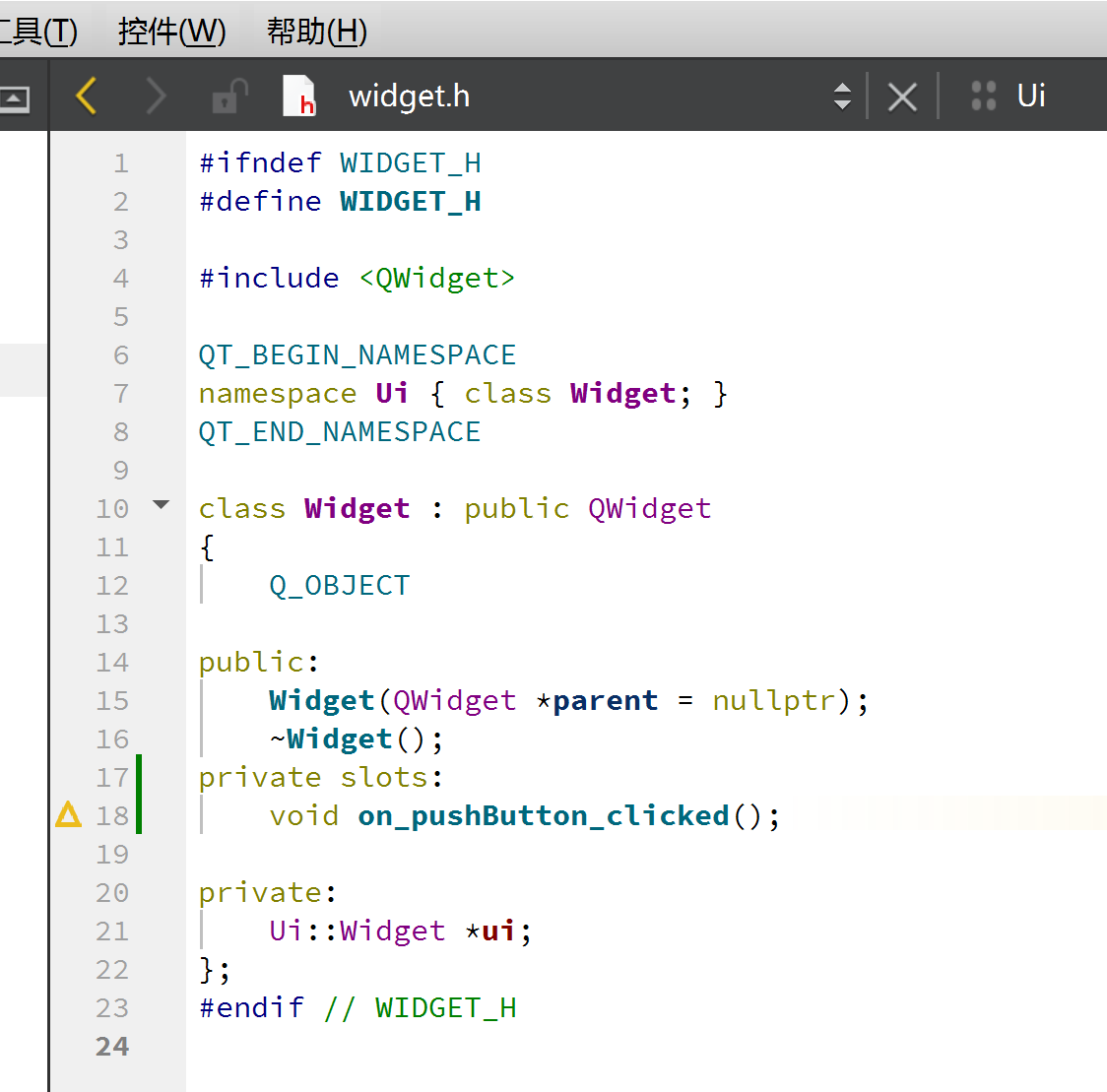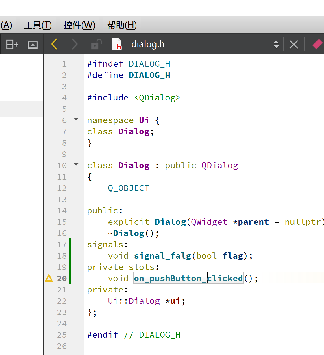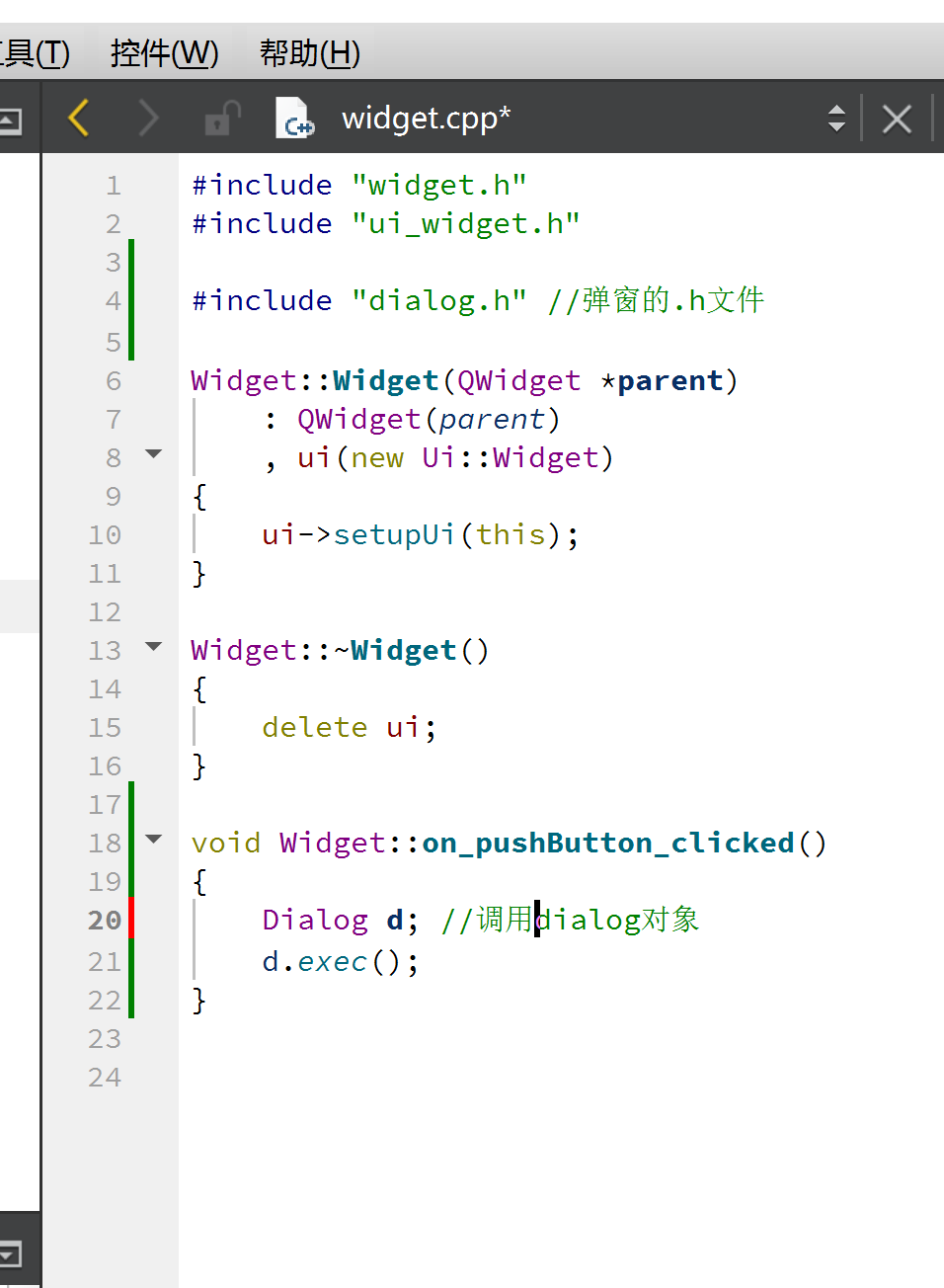 - 在widget界面里给pushButton按钮写一个槽函数来触发dialog弹窗