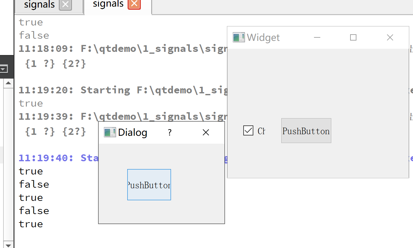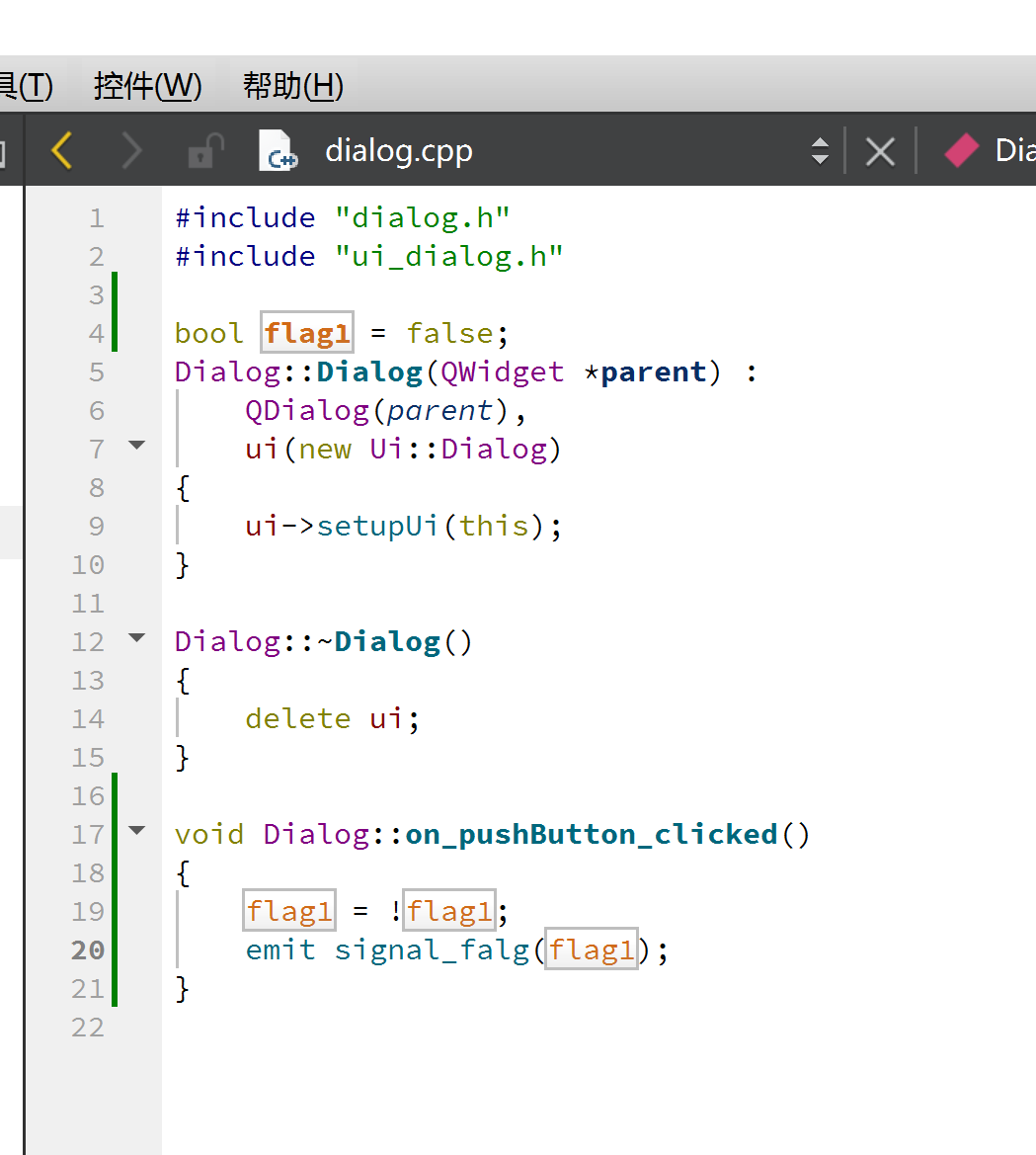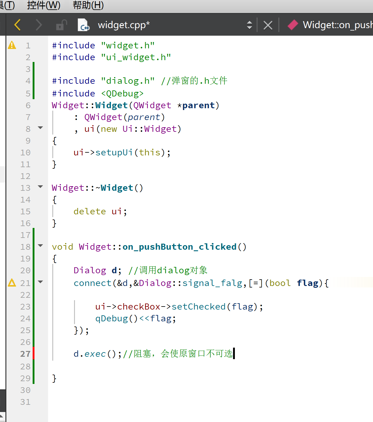 - 在dialog里写一个信号,用按钮去改变信号传输的状态位