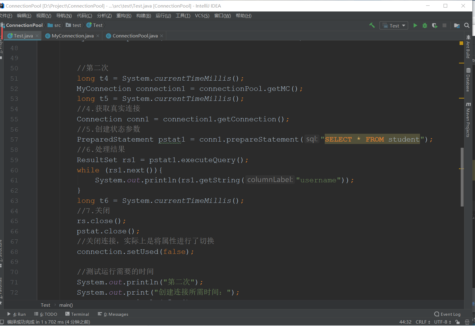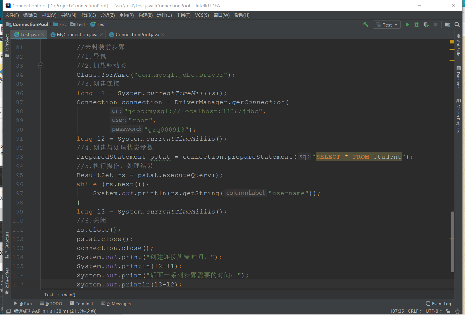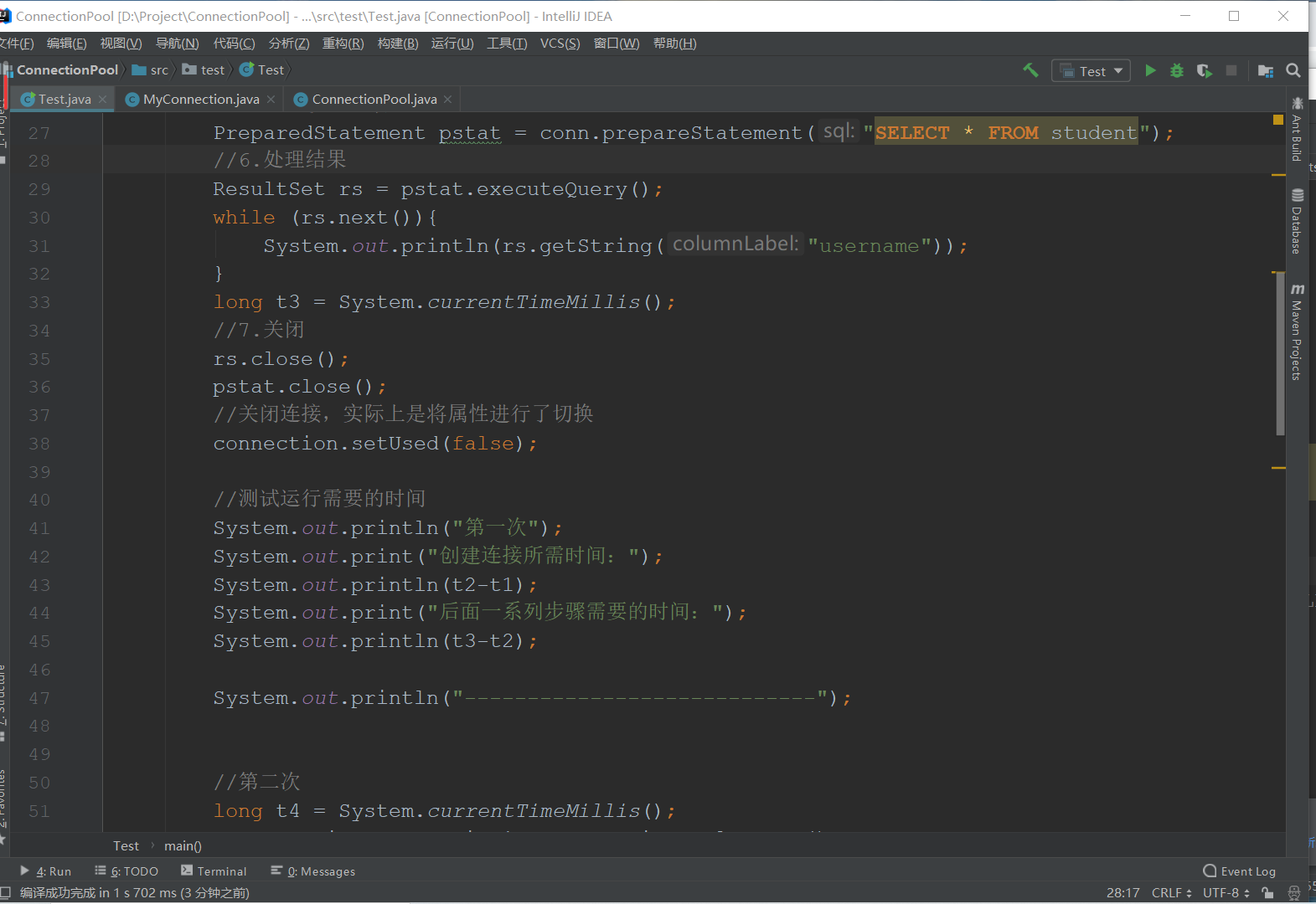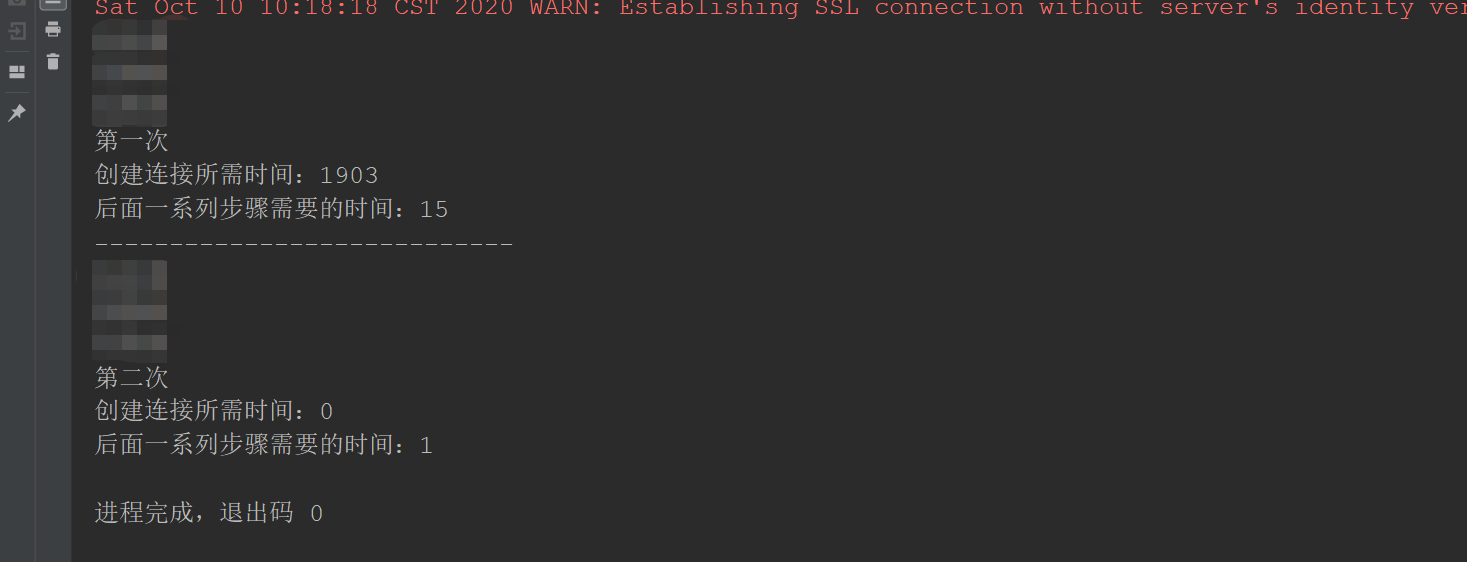 最终结果 初次加载,往连接池内存了10个连接,加载时间慢,当后续再需要连接时,从连接池内取已加载好的连接,所以消耗时间大大减少!