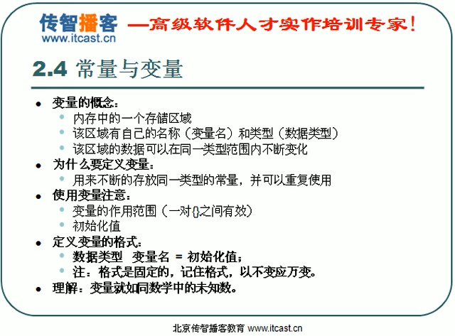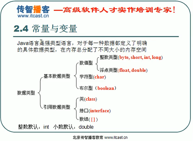 【】如果数据不确定,则在内存开辟一个空间,存储这个数据。变量之所以在内存有空间,就是为了存储这个变化的值。 【】java是强类型语言,对能识别的数据类型有严格的区分,对一个空间,要么全装白菜,要么全装西瓜。只能装同一种数据。 【】变量,先有约束,确定装那种数据类型;再给这片内存空间起个名字;最后装入固定数值;