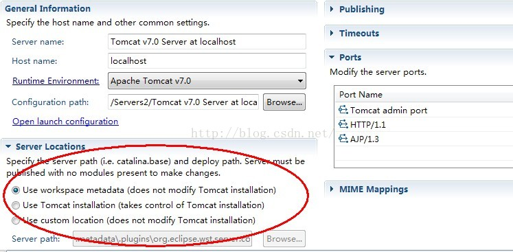 可以看到红圈中选择的是 Use workspace metadata(does not modify Tomcat installion)