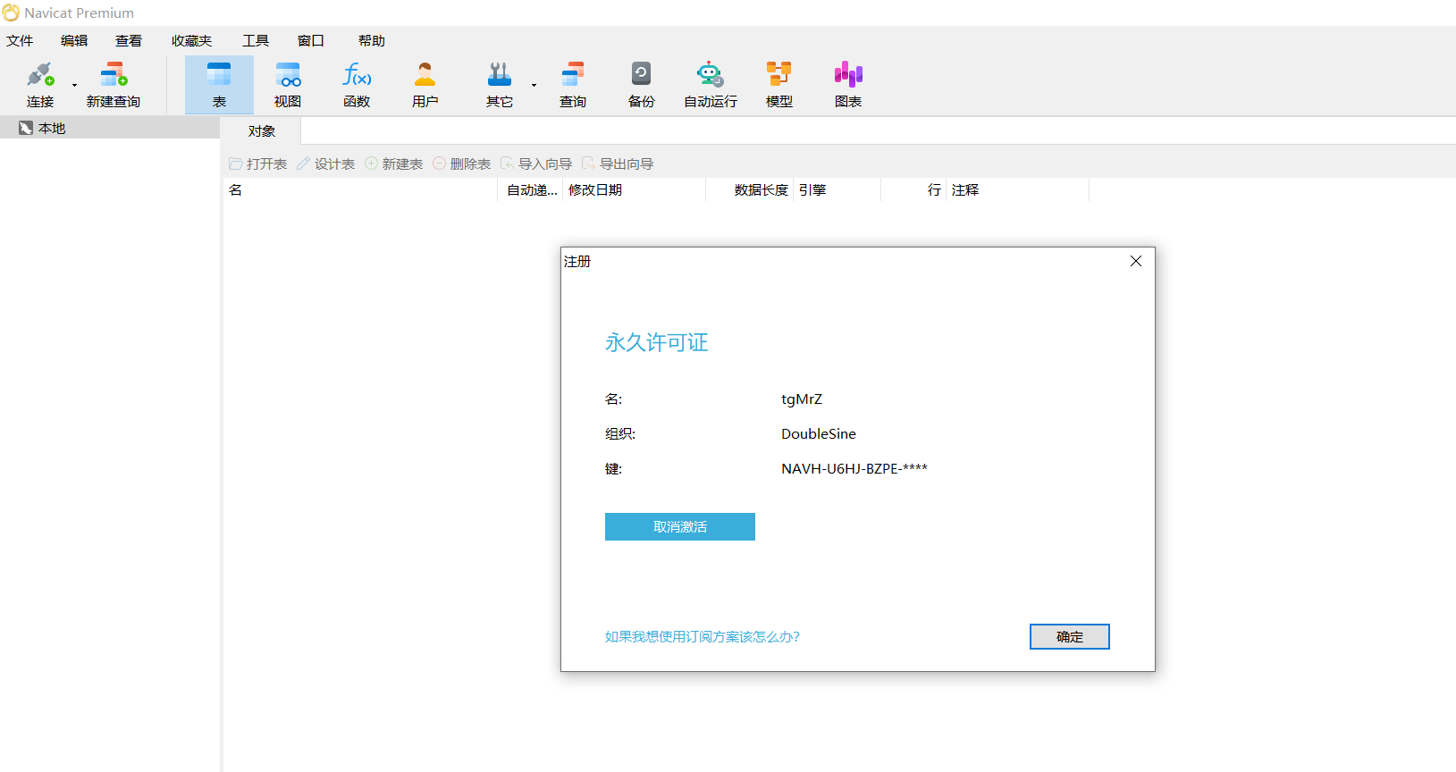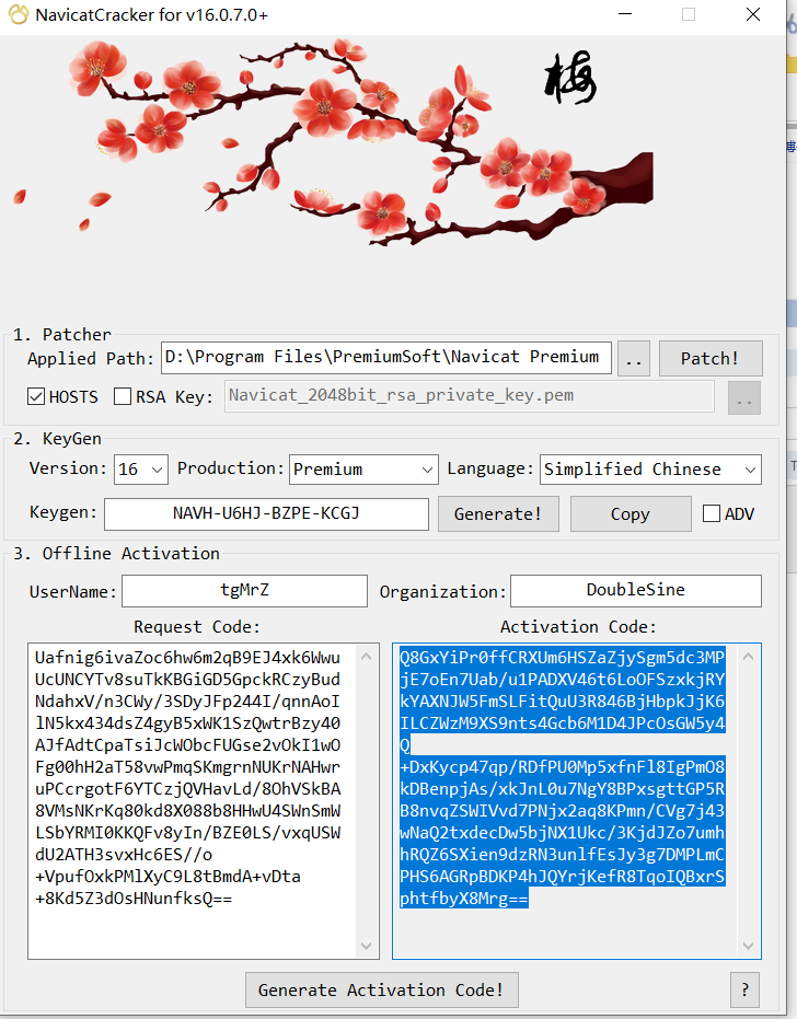 16、此时将软件注册界面中的请求码复制到注册机的Request Code栏目,然后点击注册机的 Generate Activtion Code!按钮,生成 Activtion Code,把 Activtion Code 粘贴到 Navicat 的激活码输入框中点击激活即可