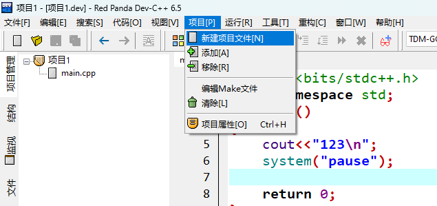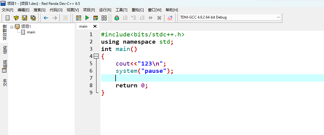 首先打开Dev-C++,新建或导入一个项目,写上自己的代码,如下图所示