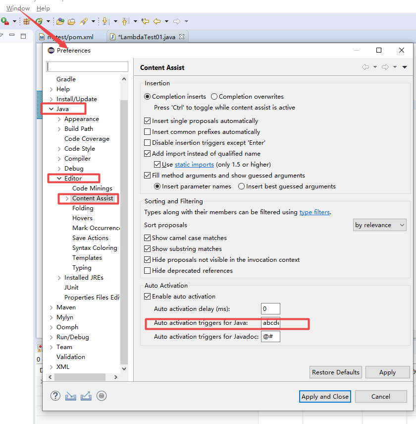 依次点击 Java –> Editor –> Content Assist –> Auto activation triggers for Java