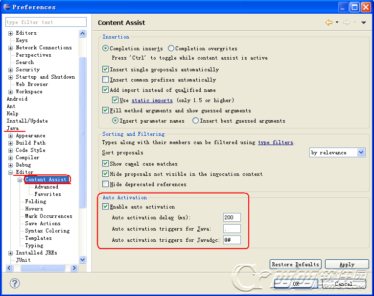 开启代码自动提示功能打开 Eclipse -> Window -> Perferences -> Java -> Editor -> Content Assist