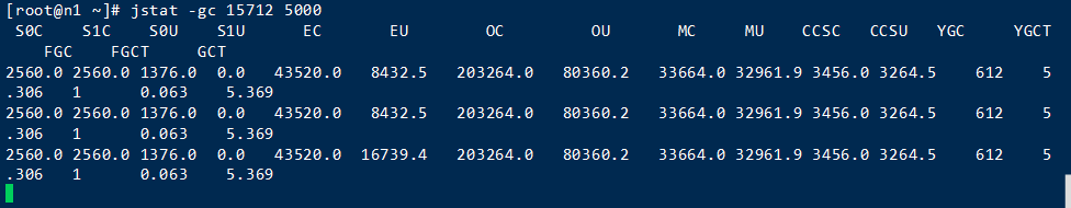 即会每5秒一次显示进程号为15712的java进成的GC情况,