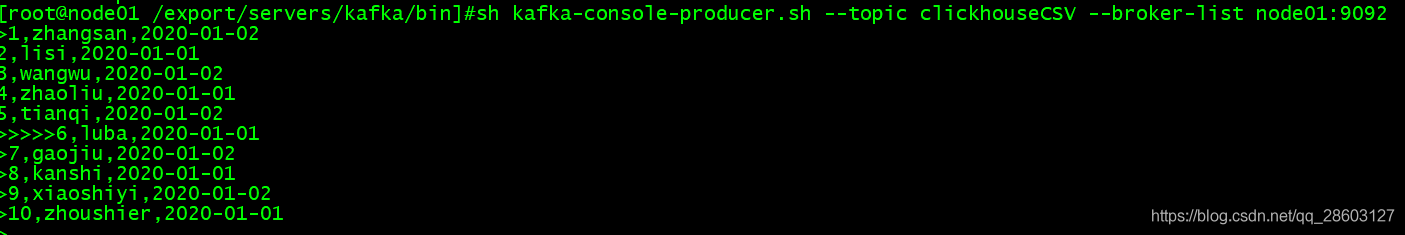 ./kafka-console-producer.sh --topic clickhouseCSV --broker-list node01:9092