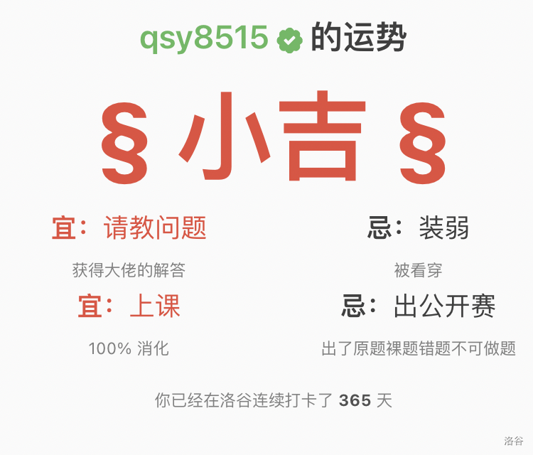 曾经我无比注重于洛谷连续打卡的天数,而今,在 365 天的节点上,这个数字将清零。这是结束,更是开始。