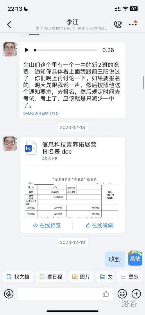 QSY 妈妈,这里有一个一中的信奥班的竞赛,通知你具体看一下,上午我跟 QSY 说过了,你们晚上再讨论一下。如果要报名的,明天先跟我说一声,然后按照它这个通知要求去报名,规定时间去考试,考上了应该就是直接进入绍兴一中了。
