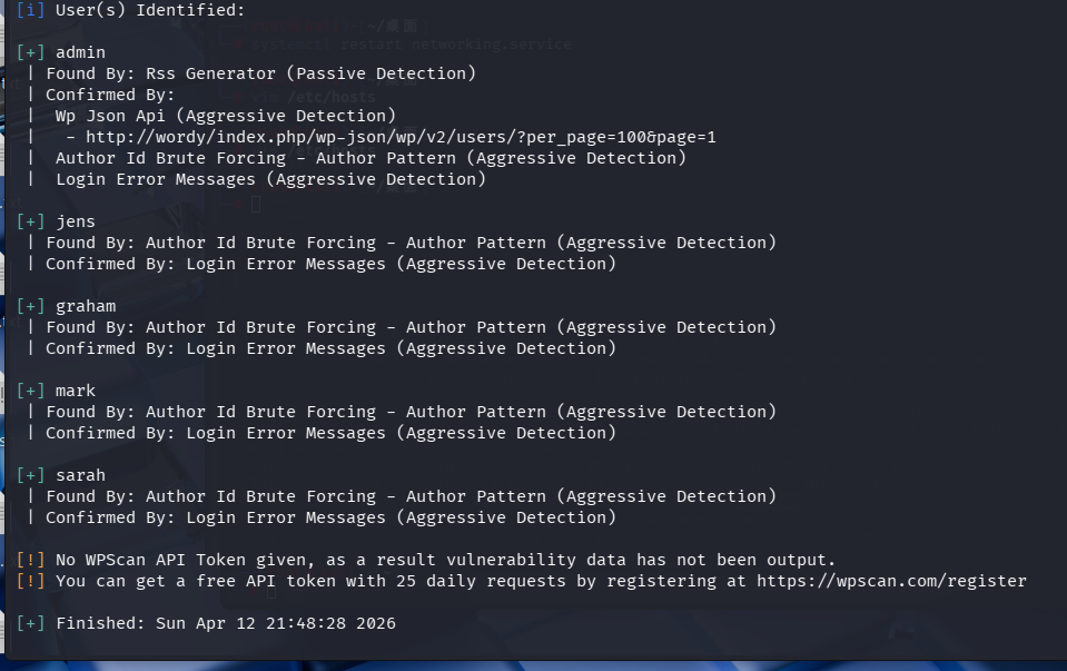 我们使用wpscan枚举一下用户名