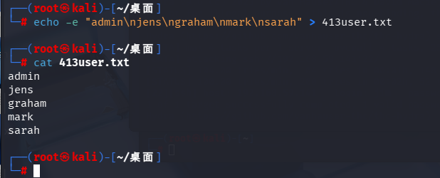 echo -e "admin\njens\ngraham\nmark\nsarah" > 413user.txt