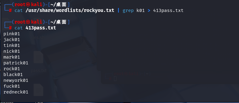 cat /usr/share/wordlists/rockyou.txt | grep k01 > 413pass.txt