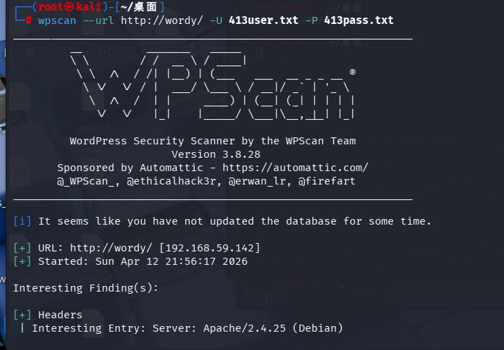 wpscan --url http://wordy/ -U 413user.txt -P 413pass.txt