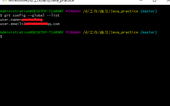 配置完成后使用"git config --global --list" 查看用户配置