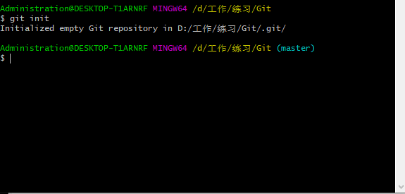 进入工作目录右键Git执行:“git init”命令创建本地仓库,生成后当前目录下会有".git"文件夹。