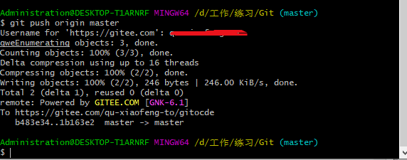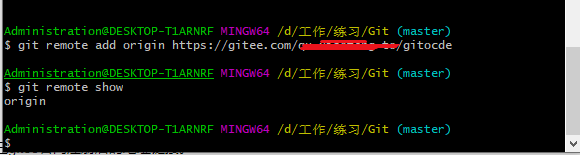 命令:git remote add origin URL //添加远程仓库起名origin,URL是你自己gitee官网注册后的地址链接。