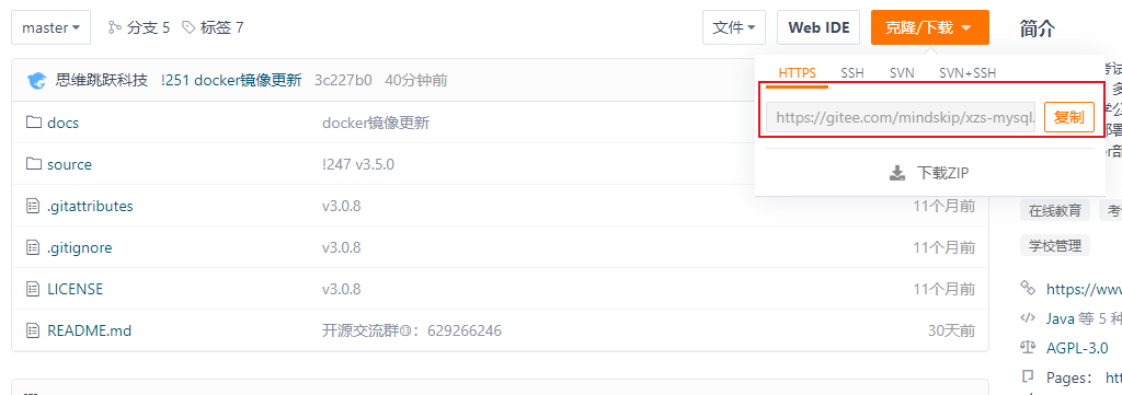 进入官网找到开源代码 点击 克隆/下载 点击 “复制”。