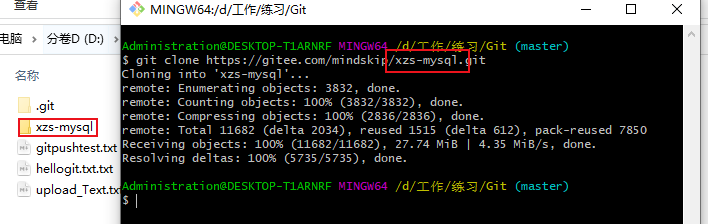在本地工作目录右键打开Git, 执行 git clone https://gitee.com/mindskip/xzs-mysql.git。