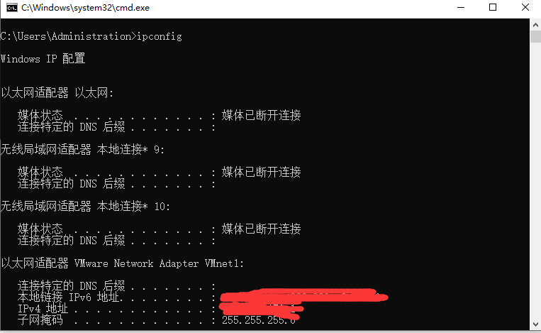 6.查看ip: “ipconfig” 详细: “ipconfig /all”