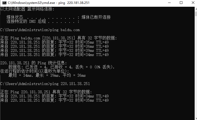 7.ping命令:“ping IP” , "ping baidu.com" 可以测试网络是否正常