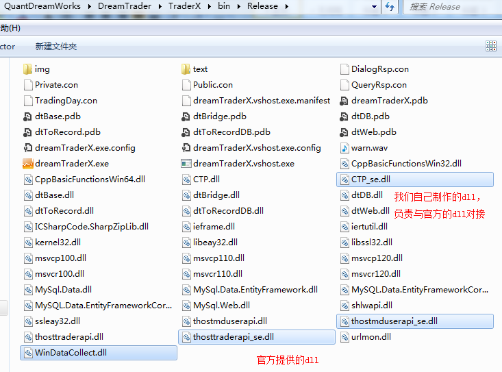 这是我的期货软件的最终的输出目录,exe文件就在里面,那么与exe文件在一起的,有很多dll,其中,上期官方提供的dll,就是“thostmduserapi_se”、“thosttraderapi_se”、“WinDataCollect”三个dll,也就是刚才说的,上期官方提供的接口。