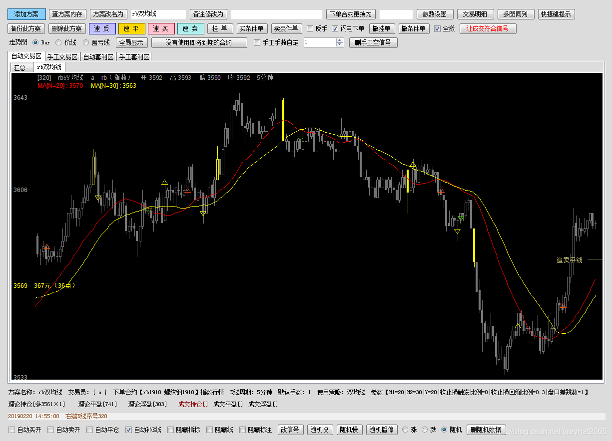 ///C++所输出的dll的位置 const string dllPath = @"CTP_se.dll"; ///引用C++中的下单函数(在C++中,下单的入口是函数“_ReqOrderInsert” [DllImport(dllPath, EntryPoint = "_ReqOrderInsert")] ///C#的下单函数,“extern”标签决定了它要按照上一句话的规定引用C++中的函数“_ReqOrderInsert” static extern void ReqOrderInsert( char[] BrokerID, //经纪公司代码(字符串,必填) char[] InvestorID, //投资者代码(字符串,必填) char[] InstrumentID, //合约代码(字符串,必填) char[] ExchangeID, //交易所代码(字符串,必填) char[] OrderRef, //报单引用(字符串,必填) char[] UserID, //用户代码(字符串,不需要就填“null”) int OrderPriceType, //报单价格条件(必填,1为任意价,2为限价,3为最优价,4为最新价, //5为最新价浮动上浮1个ticks,6为最新价浮动上浮2个ticks, //7为最新价浮动上浮3个ticks,8为卖一价, //9为卖一价浮动上浮1个ticks,10为卖一价浮动上浮2个ticks, //11为卖一价浮动上浮3个ticks,12为买一价, //13为买一价浮动上浮1个ticks,14为买一价浮动上浮2个ticks, //15为买一价浮动上浮3个ticks,16为五档价) int Direction, //买卖方向(1为买 ,-1为卖) int CombOffsetFlag, //组合开平标志(必填,1为开,0为平,-1为平今,-2为平昨,-3为强平,-4为强减,-5为本地强平) int CombHedgeFlag, //组合投机套保标志(必填,0为投机,1为套利,2为套保) double LimitPrice, //价格(实数,必填) int VolumeTotalOriginal, //手数(必填) int TimeCondition, //有效期类型(必填,1为立即完成,否则撤销,2为本节有效,3为当日有效,一般填3,4为指定日期前有效,5为撤销前有效,6为集合竞价有效) char[] GTDDate, //GTD日期(字符串,不需要就填“null”) int VolumeCondition, //成交量类型(必填,1为任何数量 ,2为最小数量 ,3为全部数量,一般填1) int MinVolume, //最小成交量(必填) int ContingentCondition, //触发条件(必填,1为立即,2为止损,3为止赢,4为预埋单,一般填1 //5为最新价大于条件价,6为最新价大于等于条件价, //7为最新价小于条件价,8为最新价小于等于条件价, //9为卖一价大于条件价,10为卖一价大于等于条件价, //11为卖一价小于条件价,12为卖一价小于等于条件价, //13为买一价大于条件价,14为买一价大于等于条件价, //15为买一价小于条件价,16为买一价小于等于条件价) double StopPrice, //止损价(实数,不需要就填“0”) int ForceCloseReason, //强平原因(必填,0为非强平 ,1为资金不足 ,2为客户超仓 ,一般填0 //3为会员超仓 ,4为持仓非整数倍 ,5为违规 ,6为其它 ,7为自然人临近交割) int IsAutoSuspend, //自动挂起标志(整数,必填,一般填0,表示不自动挂起) char[] BusinessUnit, //业务单元(字符串,不需要就填“null”) int RequestID, //请求编号(整数,不需要就填“Int32.MinValue”) int UserForceClose, //用户强评标志(整数,必填,一般填0,表示否) int IsSwapOrder, //互换单标志(整数,不需要就填“Int32.MinValue”) int tdClientI //交易通讯线程序号 ); ///单击挂买按钮的事件 private void 挂买按钮_Click(object sender, EventArgs e) { string brokerID = "9999"; string userID = "071988"; string insID = "ni2003"; string exchangeID = "SHFE"; string ordID = "10000"; int direction = 1; int oc = 1; double price = 108590; int lot = 1; int tdClientI = 0; ReqOrderInsert(brokerID.ToCharArray(), userID.ToCharArray(), insID.ToCharArray(), exchangeID.ToCharArray(), ordID.ToCharArray(), null, 2, direction, oc, 0, price, lot, 3, null, 1, 1, 1, 0, 0, 0, null, Int32.MinValue, 0, Int32.MinValue, tdClientI); }