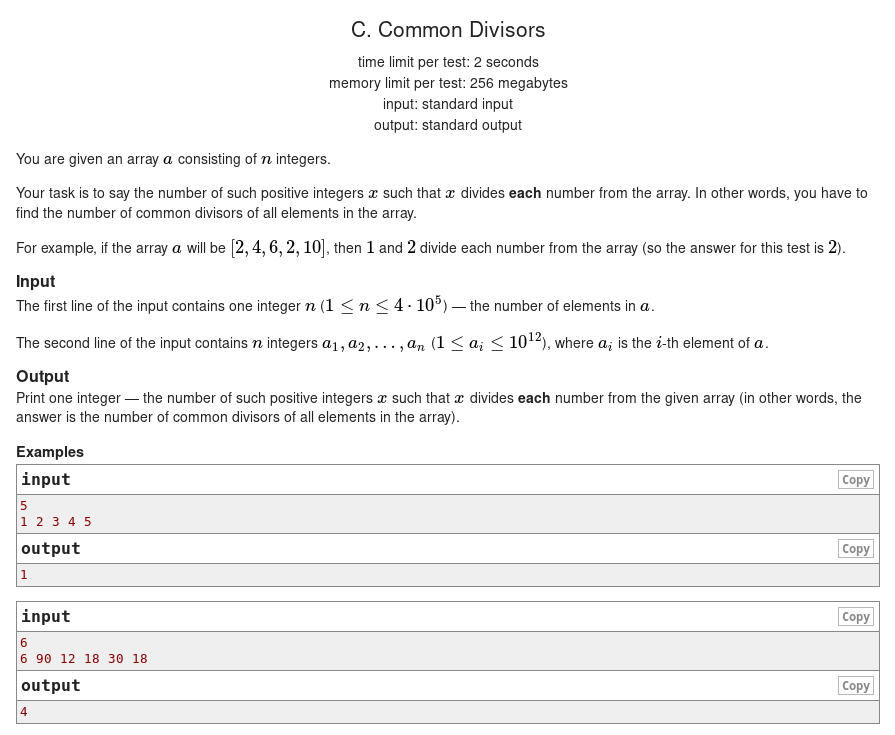 1 #include <iostream> 2 #include <algorithm> 3 using namespace std; 4 int main() { 5 int t; 6 ios::sync_with_stdio(false); 7 cin>>t; 8 long long int tmp, inp; 9 cin>>tmp; 10 t --; 11 while(t --){ 12 cin>>inp; 13 if(tmp != 1) 14 tmp = __gcd(tmp, inp); 15 } 16 long long int ans = 0; 17 for(long long i = 1; i * i <= tmp; i ++){ 18 if(tmp % i == 0){ 19 ans ++; 20 if(i * i != tmp) 21 ans ++; 22 } 23 } 24 cout<<ans<<endl; 25 return 0; 26 }
