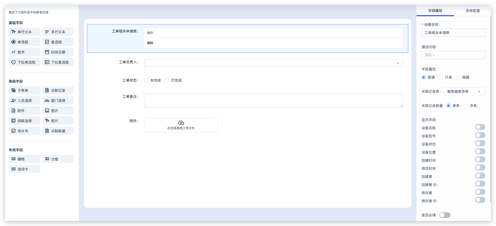 - 工单表:字段包含工单相关申请表【关联记录】、工单负责人【人员选择器】、工单状态【单选框】、工单备注【多行文本】、【附件】。