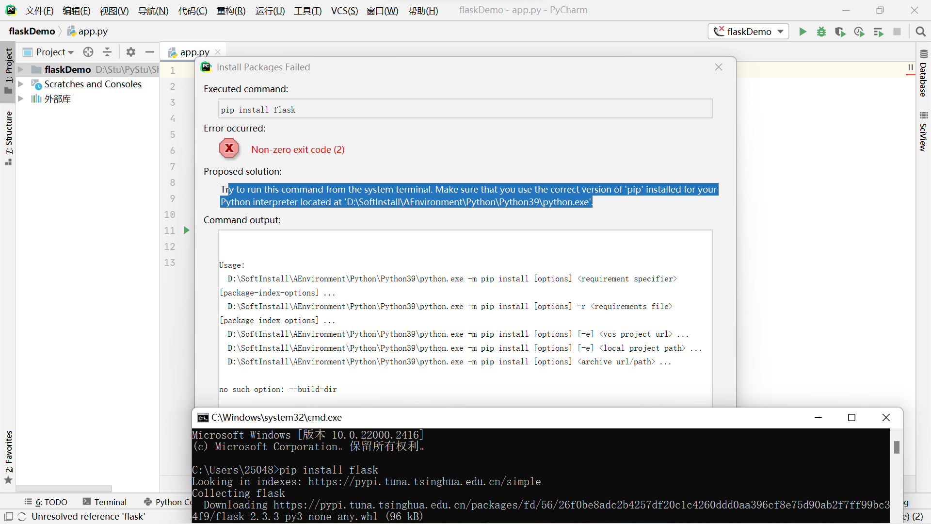 好在接着直接的经验,先把这个项目的解释器换成本机安装python路径下的解释器,还是没安成功,直接使用本机的cmd,给本机的环境安装flask,项目自然也有了!