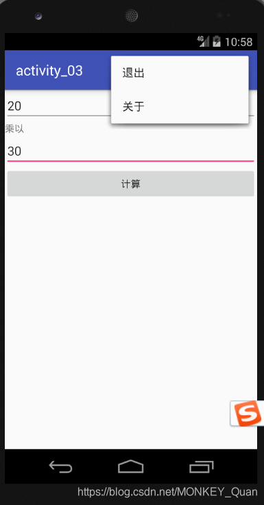 思路:需要两个activity,第一个MainActivity:显示乘数和被乘数以及按钮,收集到两个数后把数据传送到ResultActivity;第二个ResultActivity:获取MainActivity传过来的数据后计算,并显示乘积结果,设计一个Menu菜单,然后给菜单设置功能