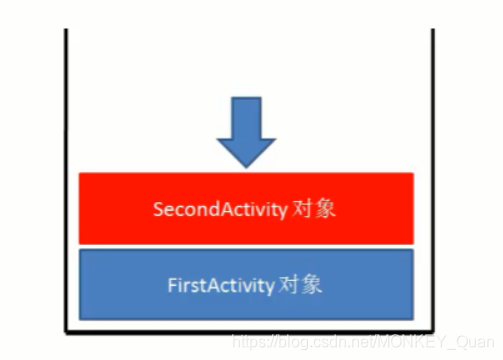 2)点击按钮启动SecondActivity,该SecondActivity对象被压入到Stack中,显示栈顶Activity,所以此时手机显示SecondActivity