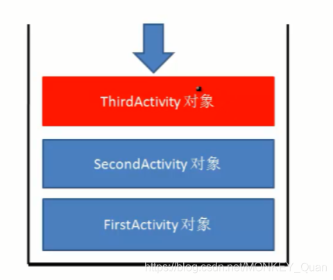 3)点击SecondActivity中的按钮之后,启动ThirdActivity,ThirdActivity被压入到Stack中