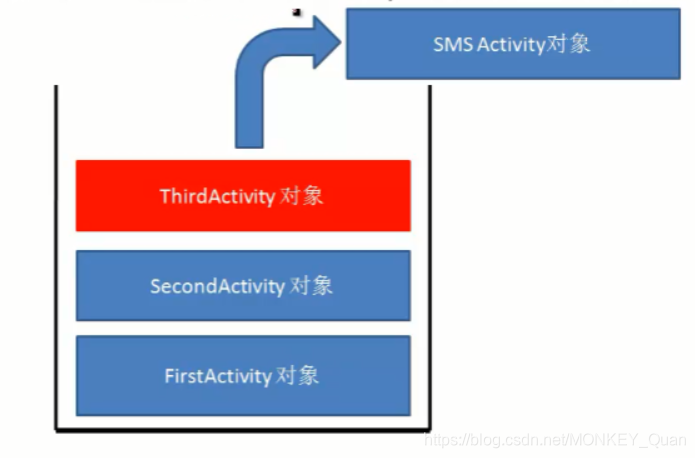5)点击Back按钮,这时SMS Activity对象从栈中弹出,ThirdActivity成为栈顶Activity,对用户可见,弹出的所有Activity都会调用自己的onDestory方法