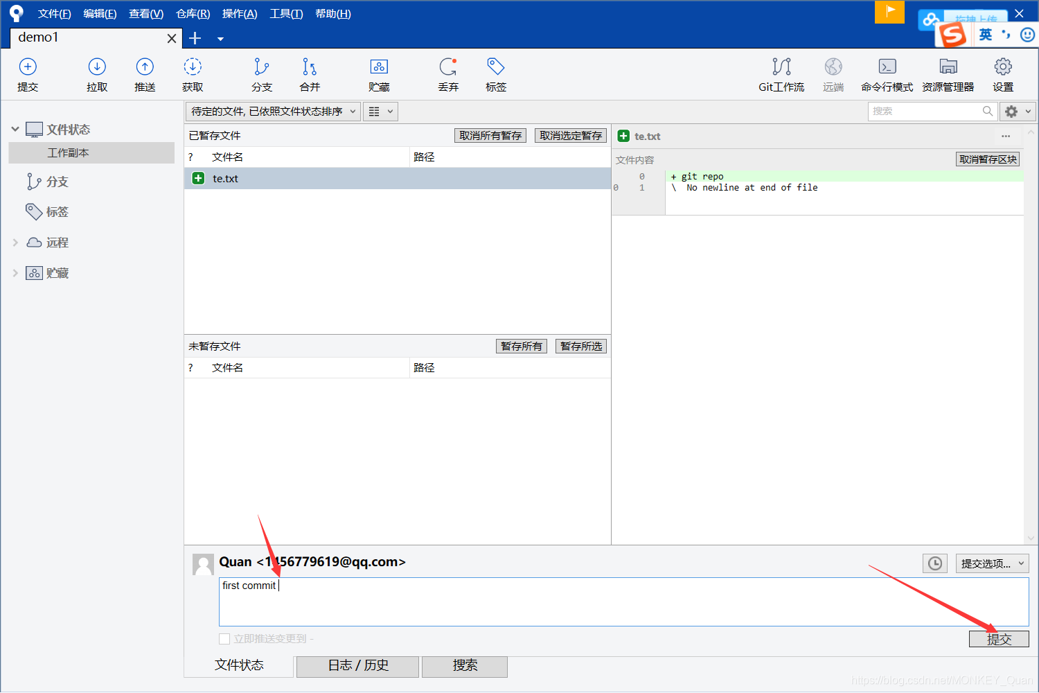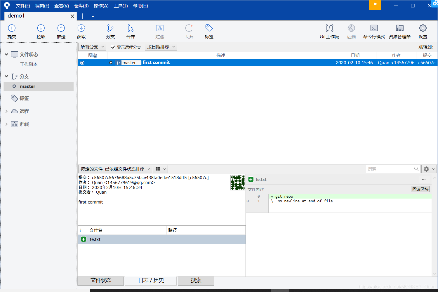 我们下面以一个例子来解释:创建一个文件然后提交到本地仓库中
