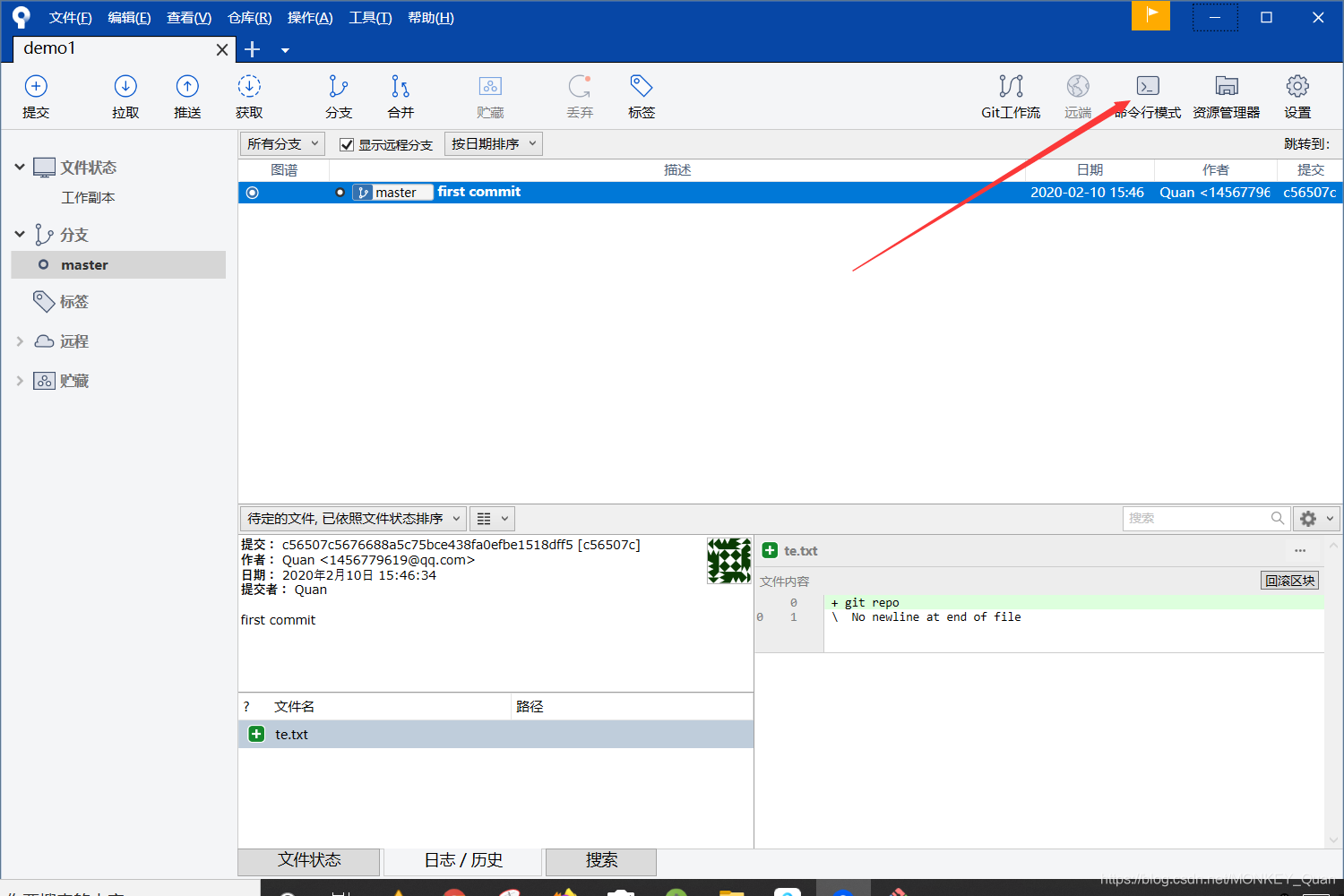 1、打开git bash,当然在sourcetree中点击命令行模式也能打开