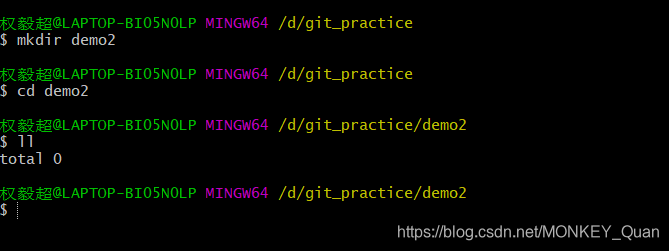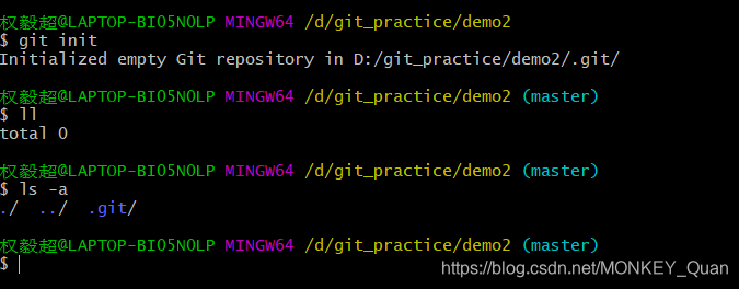 这时通过ls -a命令,显示demo2文件中有一个.git文件,即仓库创建成功。-a的意思就是显示全部的文件,包括隐藏文件