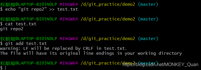 然后我们通过管道追加(>>)创建一个test.txt文件,并添加文件到暂存区(git add)