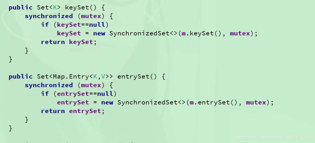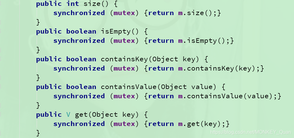 在创建完synchronizedMap后,对map进行操作时,就会对该方法进行上锁,实现线程安全。