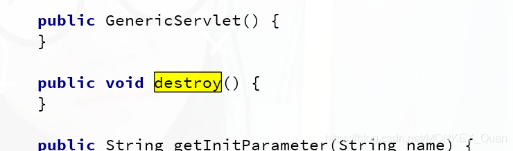 在源码中,GenericServlet这个类里面实现了父接口Servlet的方法destory(),但是没有方法体,我就很纳闷,没有方法体怎么销毁servlet对象呢?