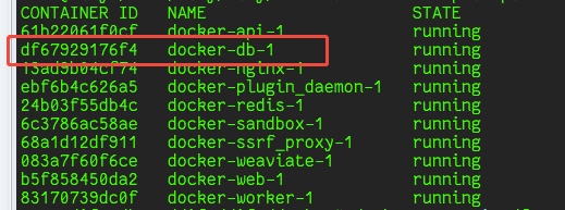 一、进入到/home/dify/dify/docker目录执行:docker# docker compose ps --format "table {{.ID}}\t{{.Name}}\t{{.State}}"