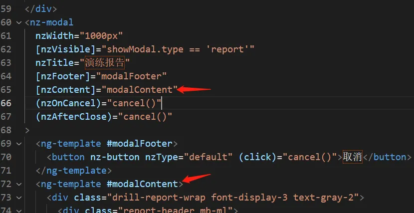 2、使用nz-modal,以template形式引用content,赋值给nzContent