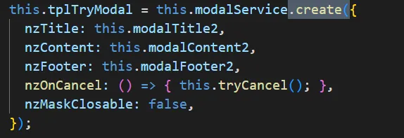 3、以modalService的形式创建弹窗,也是以template形式引用content,赋值给nzContent