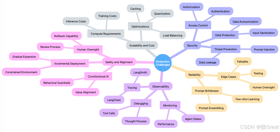 思维导图展示了 LLM Agent生产系统的五大挑战。中心节点“生产挑战”分为:可靠性(涵盖即时脆弱性和边缘情况)、可扩展性和成本(涵盖计算要求和优化)、安全性(涵盖访问控制、数据保护和威胁预防)、可观察性(涵盖跟踪、监控和调试)以及安全性和一致性(涵盖宪法 AI、人工监督和增量部署)。每个分支都包含该挑战的实施细节和具体解决方案。